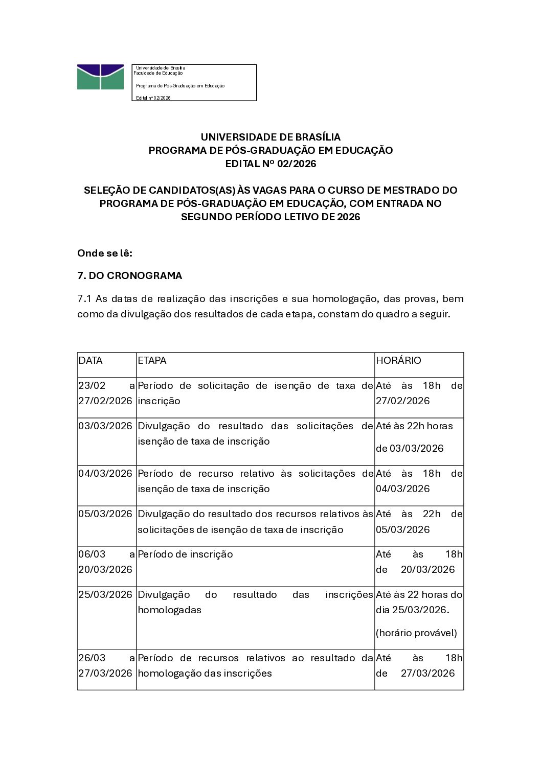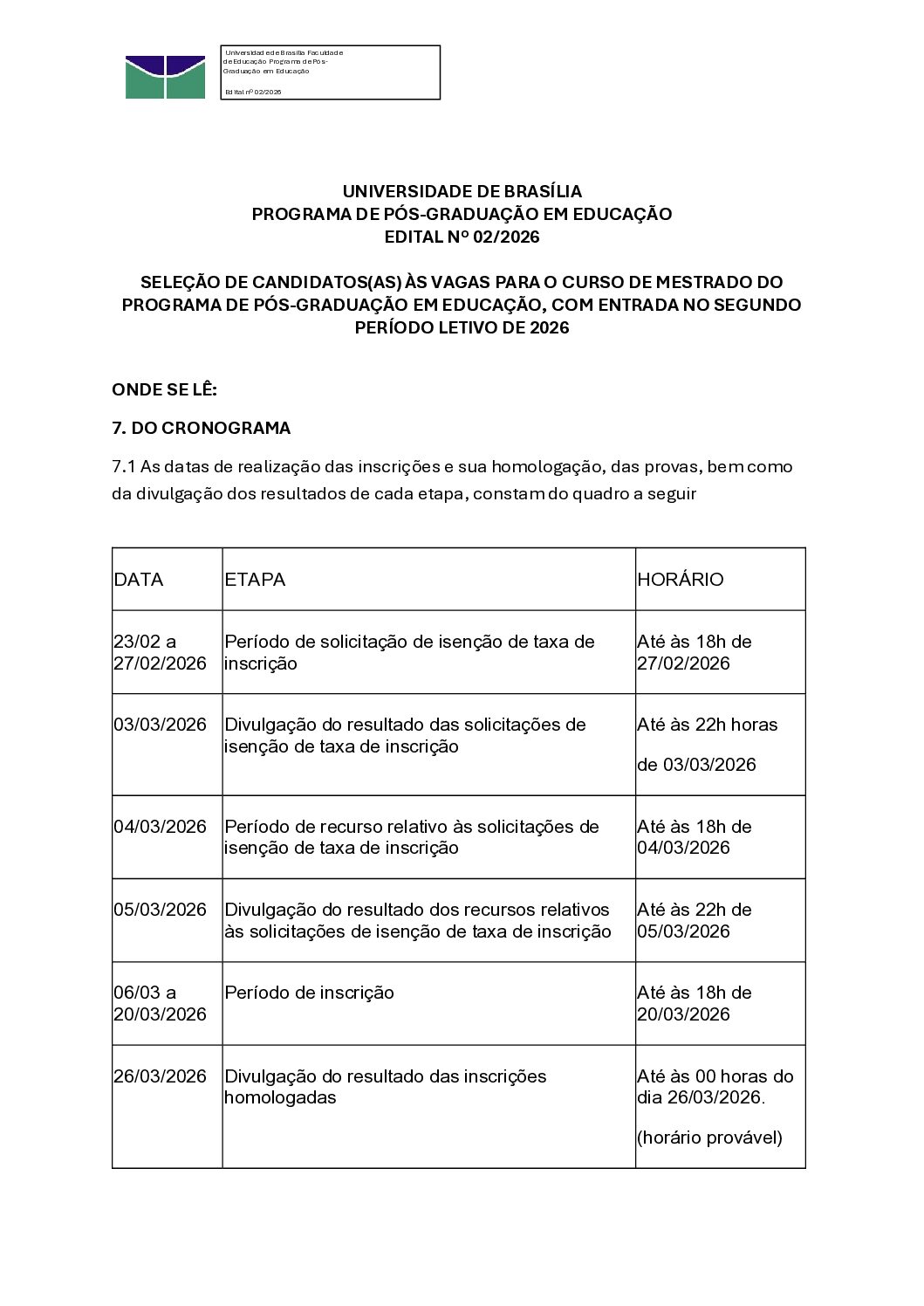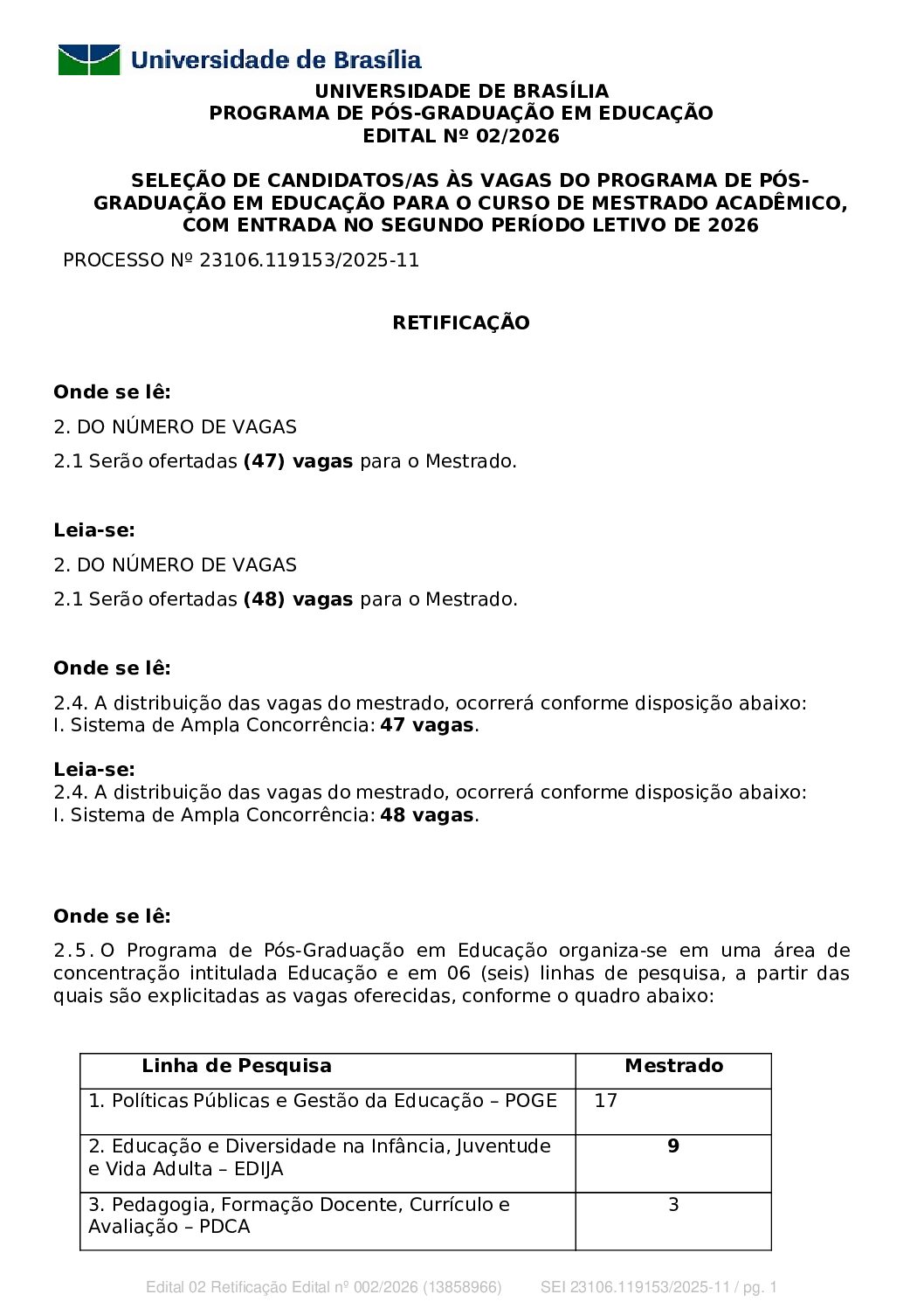 A Coordenadora do Programa de Pós-Graduação em Educação - PPGE, no uso de suas atribuições legais, torna público e estabelece as normas do processo seletivo para o preenchimento das vagas dos cursos de mestrado acadêmico em educação, ofertado na modalidade presencial, em conformidade com as exigências do Regulamento deste Programa, da Resolução nº 80/2021 do Conselho de Ensino, Pesquisa e Extensão da UnB, da Resolução nº 044/2020 do Conselho de Ensino, Pesquisa e Extensão da UnB, da Resolução nº 05/2020 da Câmara de Pesquisa e Pós-Graduação da UnB e da Resolução nº 06/2020 da Câmara de Pesquisa e Pós-Graduação da UnB.