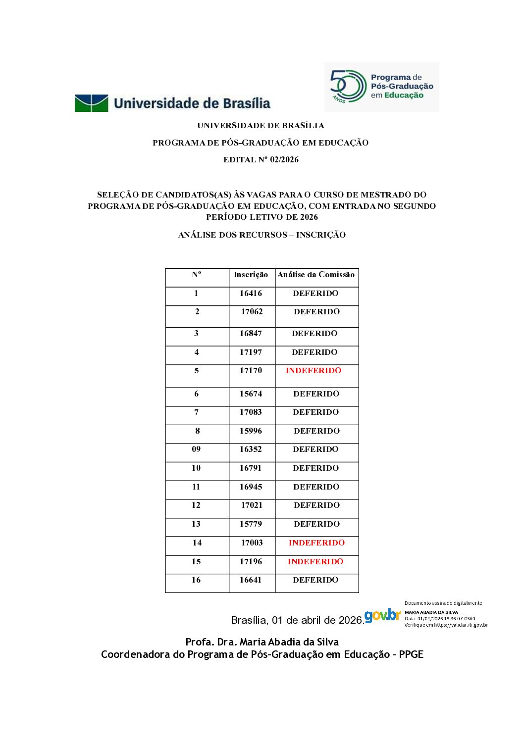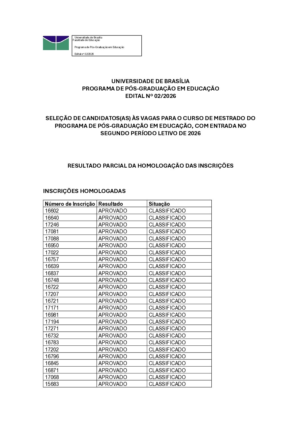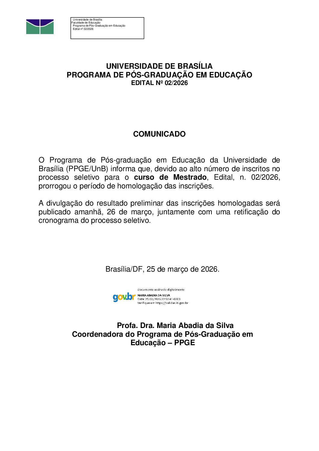 A Coordenadora do Programa de Pós-Graduação em Educação - PPGE, no uso de suas atribuições legais, torna público e estabelece as normas do processo seletivo para o preenchimento das vagas dos cursos de mestrado acadêmico em educação, ofertado na modalidade presencial, em conformidade com as exigências do Regulamento deste Programa, da Resolução nº 80/2021 do Conselho de Ensino, Pesquisa e Extensão da UnB, da Resolução nº 044/2020 do Conselho de Ensino, Pesquisa e Extensão da UnB, da Resolução nº 05/2020 da Câmara de Pesquisa e Pós-Graduação da UnB e da Resolução nº 06/2020 da Câmara de Pesquisa e Pós-Graduação da UnB.